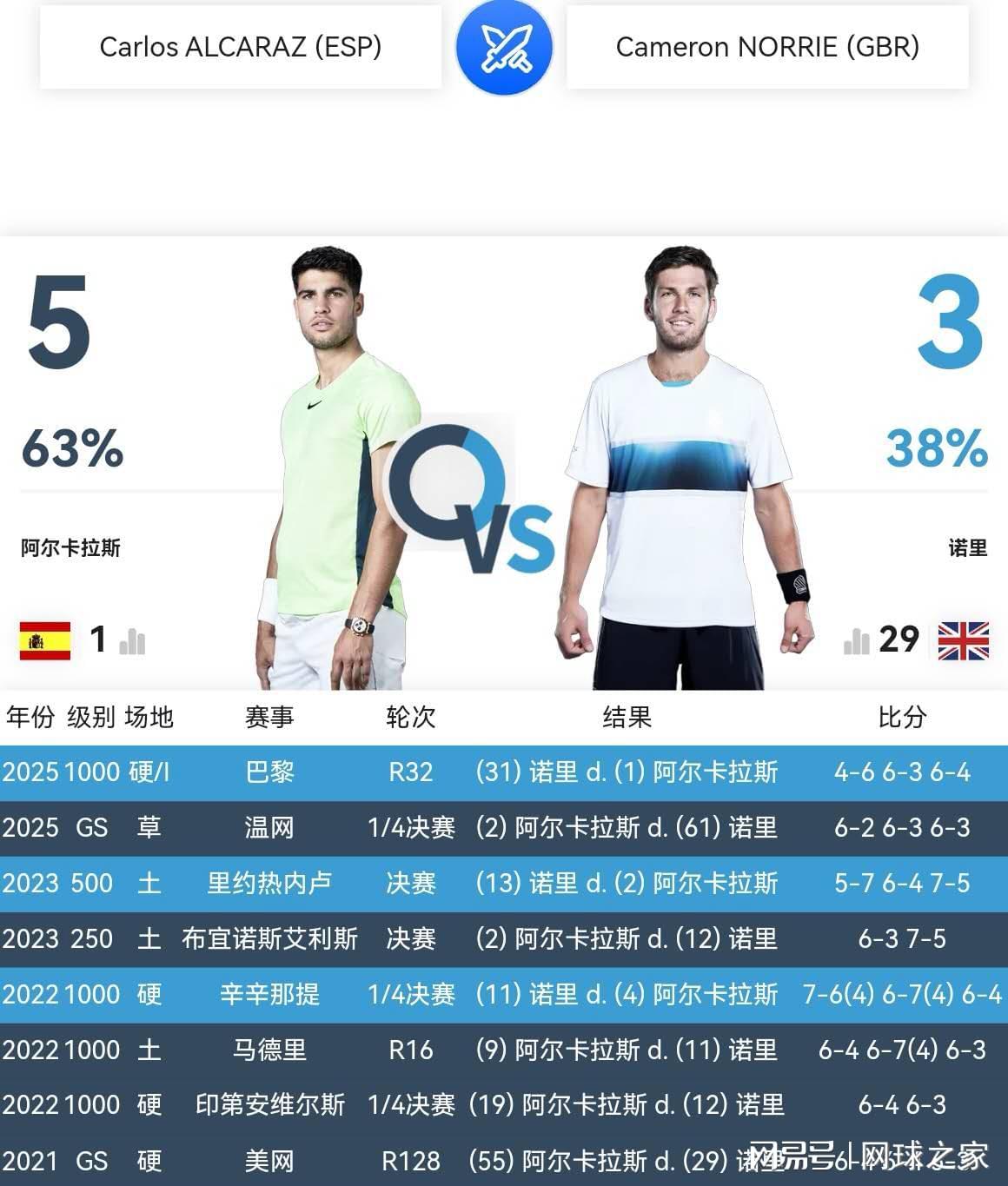 其三、大器晚成的英国左手将诺里,职业生涯至今与阿尔卡拉斯交锋八次,取得三胜五负的佳绩,这在ATP巡回赛颇为少见。放眼ATP巡回赛,能够三次以上战胜阿尔卡拉斯的选手屈指可数,只有五位,他们是:德国战车小兹维列夫(六次)、意大利新人王辛纳(六次)、塞尔维亚天王德约科维奇(五次)、加拿大酷小黑阿利亚西姆(三次)、英国左手将诺里(三次)。